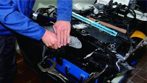 在鋁質面板修復時,也可使用鋁整形機對損傷部位進行拉伸修復,在經整形機修復到位后,使用專用工具將螺紋介子齊根剪下,再打磨平整即可。對于鋼板車身來說,當面板和內層結構同時發(fā)生變形時,可以采取內外層分離、分別修整,然后折邊咬合的修復方法。對于鋁質面板,不能使用這種方法,否則由于鋁的韌度較差,折邊部位會出現(xiàn)裂紋或斷裂。