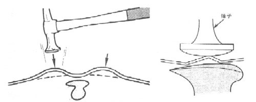 (1)為了降低拱起部位的高度,如果采用正托敲擊法,操作時應多次輕敲,不能重敲,否則錘擊太重或次數(shù)過多會使鋁板延展拉伸,如圖1-89所示是正托敲擊法示意圖。