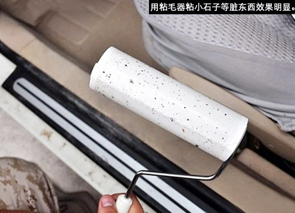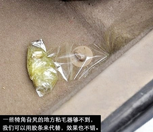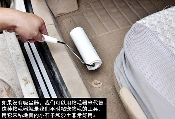 如果沒有吸塵器怎么辦呢?別急,我們可以用粘毛器或膠條來代替吸塵器,效果也是比較明顯的。我們可以先用粘毛器來清潔地面平整的部分,一些角落或座位下等不容易清理的部分可以用膠條來清理。