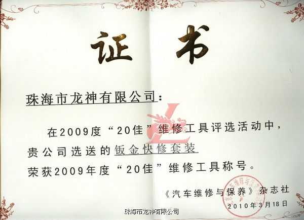 2010年北京汽保春季展期間,由中國汽車保修設(shè)備行業(yè)協(xié)會(huì)和《汽車維修與保養(yǎng)》雜志共同舉辦的2009年度“20佳”維修工具頒獎(jiǎng)典禮,于2010年3月18日在北京江河水鳥巢麗景隆重舉行,龍神“鈑金快修套裝”在眾多候選產(chǎn)品中脫穎而出,獲得本屆評(píng)審委員會(huì)專業(yè)評(píng)委的一致認(rèn)可:符合產(chǎn)品創(chuàng)新性、實(shí)用性、效率性,可幫助企業(yè)提高工作效率,授予“中國汽車維修市場(chǎng)2009年度20佳”榮譽(yù)稱號(hào)。