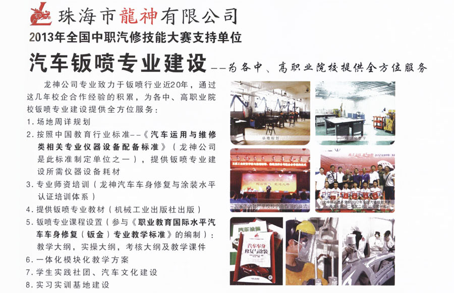 龍神汽車車身修復(fù)與涂裝 水平認(rèn)證培訓(xùn)體系 2013-06-03 25274 龍神公司專業(yè)致力于鈑噴行業(yè)近20年,通過這幾年校企合作經(jīng)驗(yàn)的積累,為各中、高職業(yè)院校鈑噴專業(yè)建設(shè)提供全方位服務(wù)。