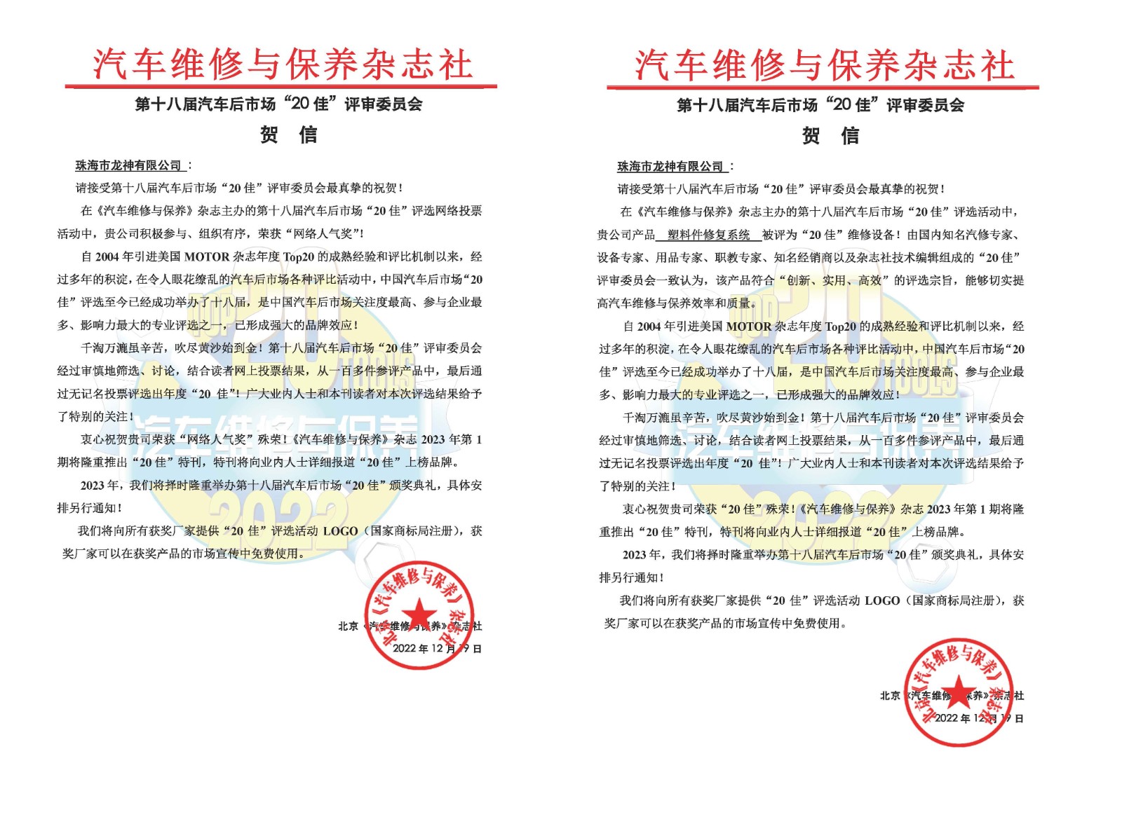 2023年2月16日,由《汽車維修與保養(yǎng)》雜志主辦的第十八屆汽車后市場“20佳”維修工具頒獎盛典在深圳舉行,在維修設(shè)備與網(wǎng)絡(luò)人氣評比活動中,龍神明星產(chǎn)品“塑料件修復(fù)系統(tǒng)”榮獲2022年度“20佳”維修設(shè)備和龍神公司榮獲2022年度“20佳”網(wǎng)絡(luò)人氣獎殊榮。